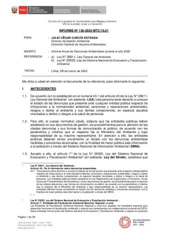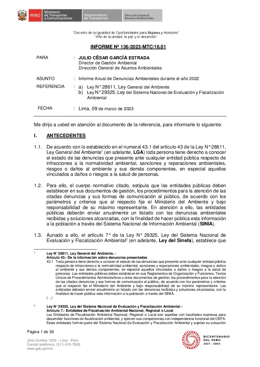 Informe Anual de Denuncias Ambientales durante el año 2022 del Ministerio de Transporte y Comunicaciones