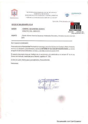 Informe anual de denuncias ambientales recibidas y atendidas en el 2020 por la Municipalidad Provincial de Huamanga