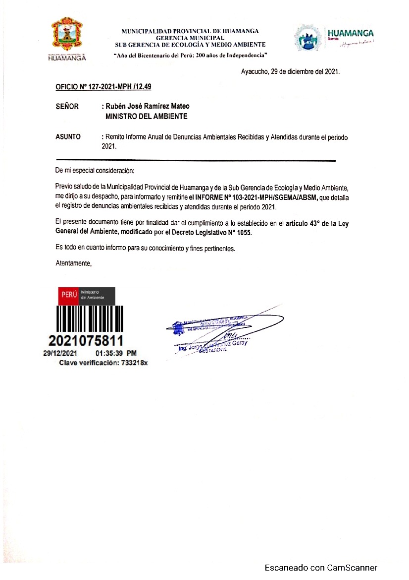 Informe anual de denuncias ambientales recibidas y atendidas durante el periodo 2021 de la Municiapalidad Provincial de Huamanga