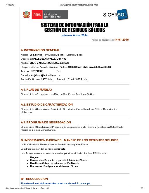 Se registró la información sobre la gestión y manejo de los residuos sólidos correspondiente al año 2014 en el Sistema de Información para la Gestión de Residuos Sólidos (SIGERSOL), correspondiente a la provincia de Julcán, región La Libertad.