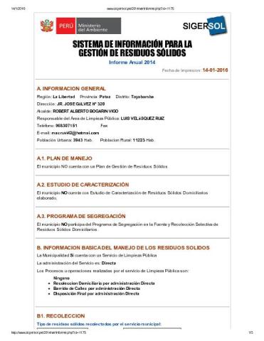 Se registró la información sobre la gestión y manejo de los residuos sólidos correspondiente al año 2014 en el Sistema de Información para la Gestión de Residuos Sólidos (SIGERSOL), correspondiente a la provincia de Pataz, región La Libertad.