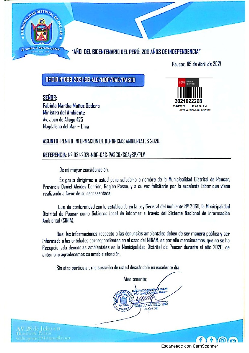 Informe de denuncias ambientales del 2020 de la Municipalidad Distrital de Paucar