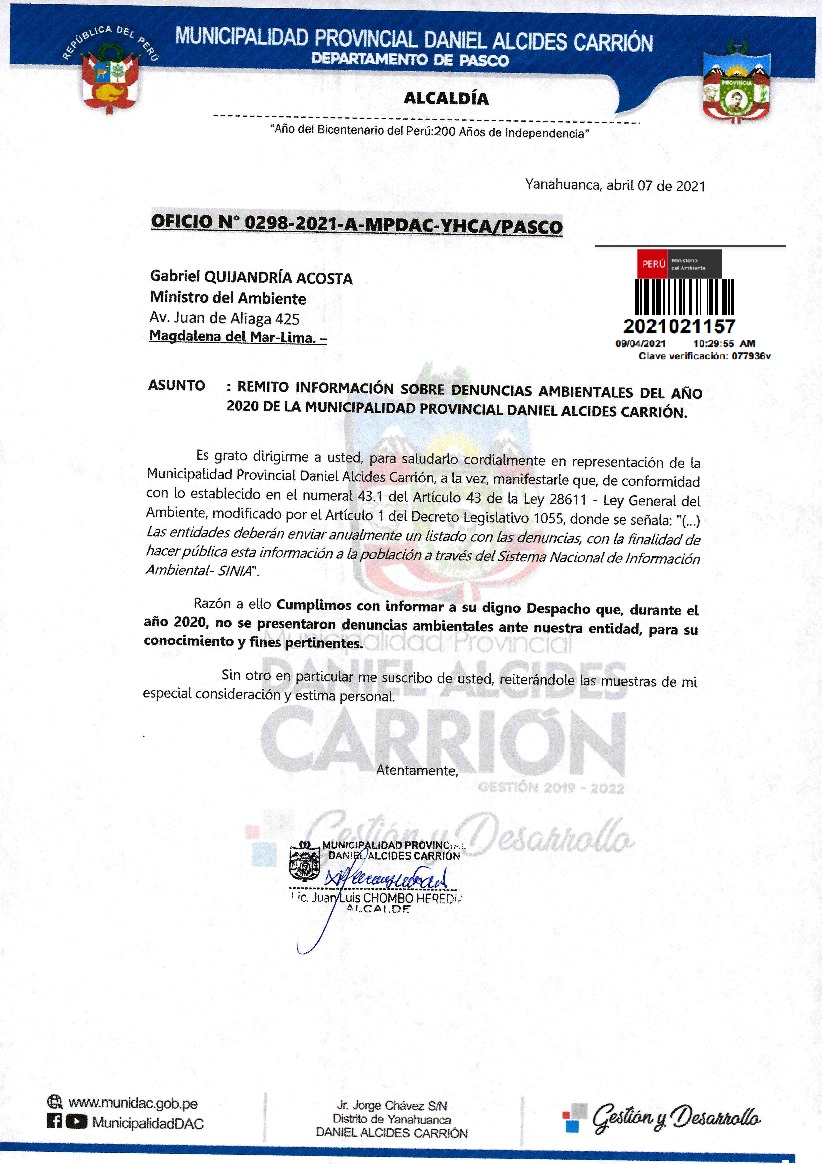 Informe de denuncias ambientales del 2020 de la Municipalidad Provincial de Daniel Alcides Carrión