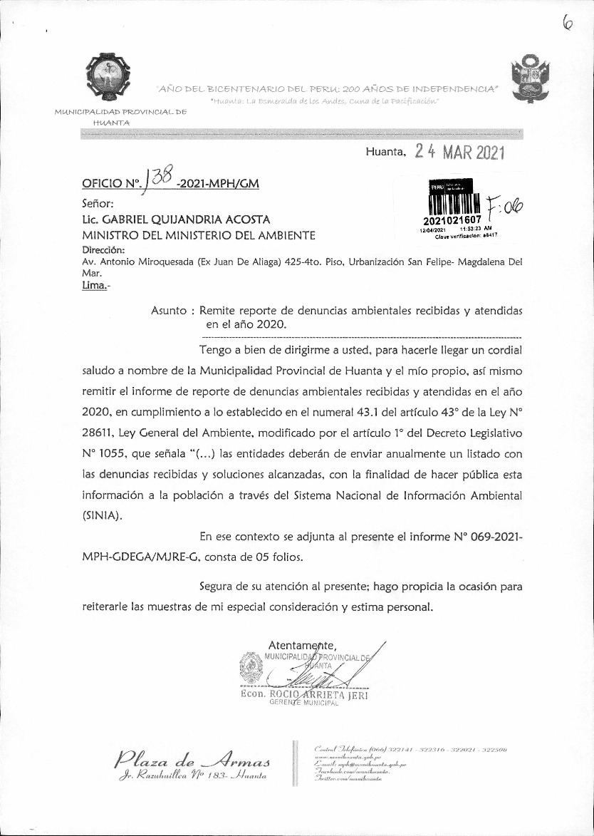 Informe de denuncias ambientales del 2020 de la Municipalidad Provincial de Huanta