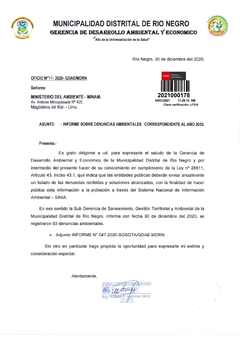 Informe sobre denuncias ambientales del año 2020 de la Municipalidad Distrital de Rio Negro
