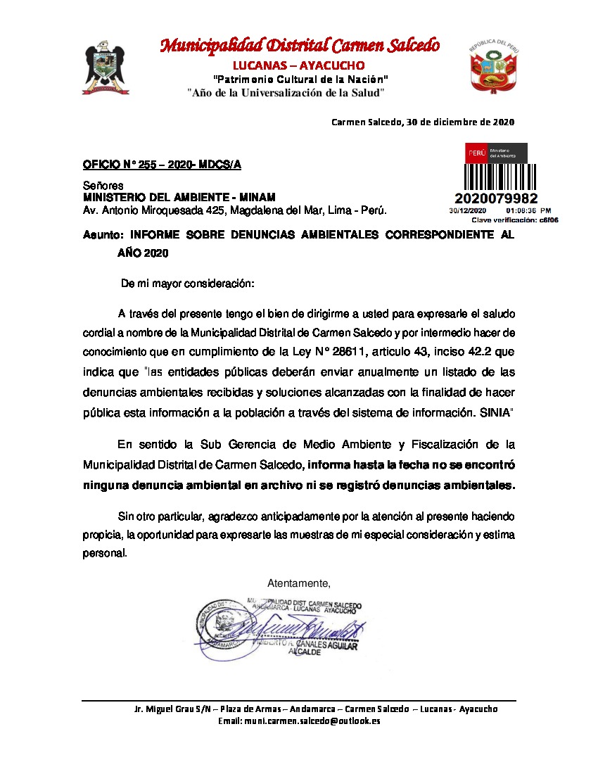 INFORME SOBRE DENUNCIAS AMBIENTALES CORRESPONDIENTE AL AÑO 2020 DE LA MUNICIPALIDAD DISTRITAL DE CARMEN SALCEDO