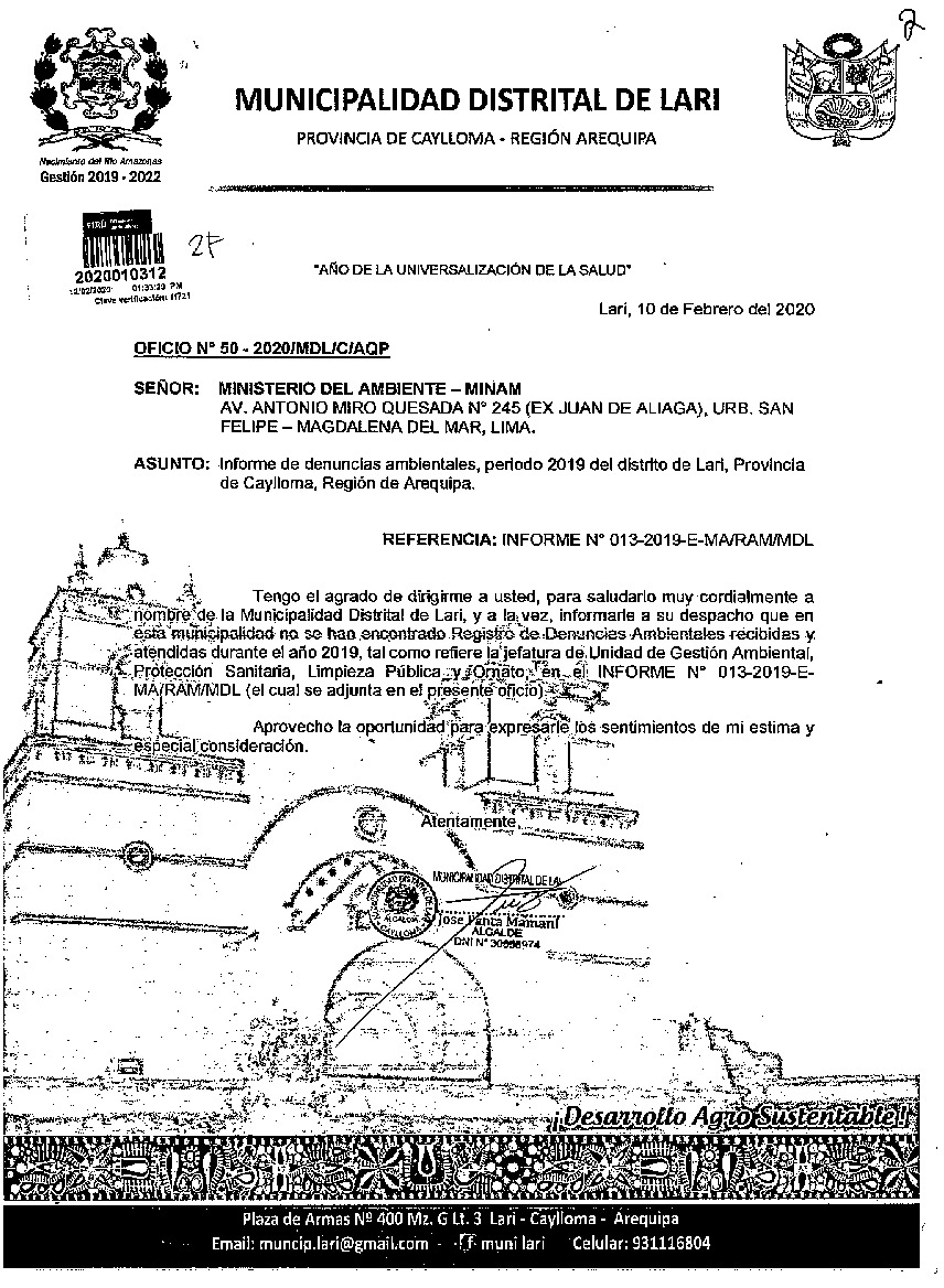 Informe de denuncias ambientales, periodo 2019 del distrito de Lari, Provincia de Caylloma, Región de Arequlpa
