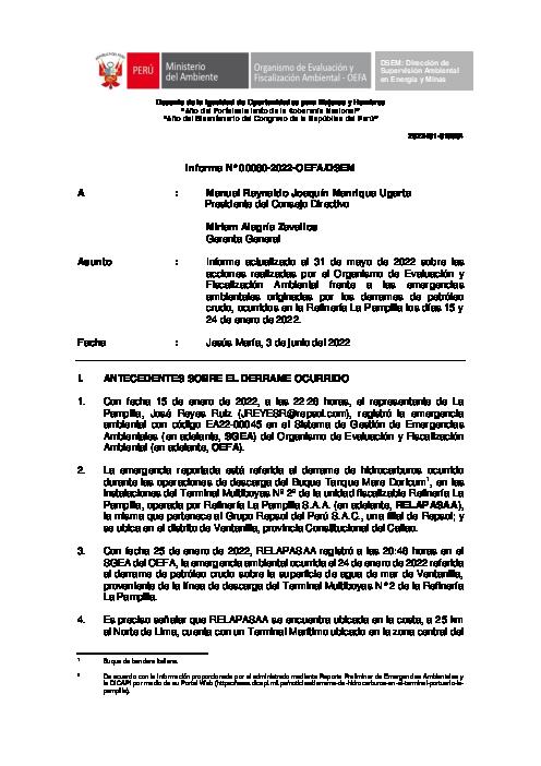 Informe actualizado al 31 de mayo de 2022 sobre las acciones realizadas por el Organismo de Evaluación y Fiscalización Ambiental frente a las emergencias ambientales originadas por los derrames de petróleo crudo, ocurridos en la Refinería La Pampilla los días 15 y 24 de enero de 2022.