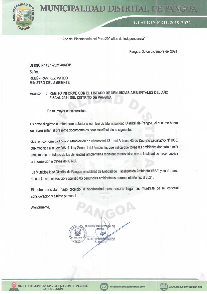 Informe con el listado de denuncias ambientales del año fiscal 2021 del distrito de Pangoa