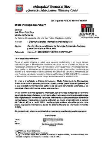Informe con listado de denuncias ambientales recibidas y atendidas en el año fiscal 2022 Municipalidad Provincial de Piura