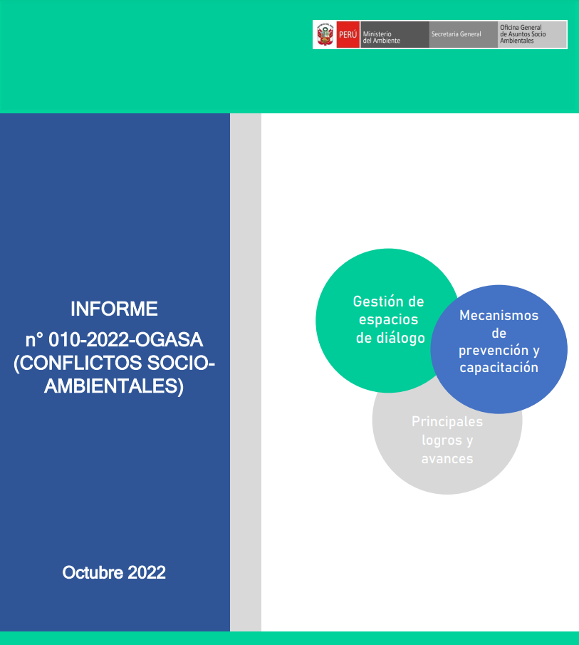 El presente informe desarrolla los avances en la prevención y gestión de la conflictividad socioambiental del MINAM del mes de octubre de 2022. En la primera parte se presentan los avances en los espacios de diálogo y seguimiento de compromisos. En la segunda parte se desarrollan las acciones preventivas. En la tercera parte se plantean algunos logros y, finalmente se registran las principales conclusiones.