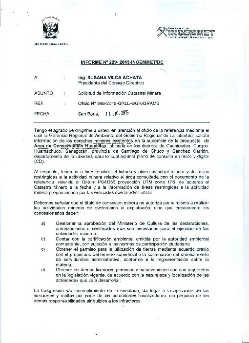 Información de los derechos mineros existentes en la superficie de la propuesta de Área de Conservación Huaylillas, ubicada en los distritos de Cachicadán, Curgos, Huamachuco, Sanagoran, provincias de Santiago de Chuco y Sánchez Carrión, departamento de La Libertad.
