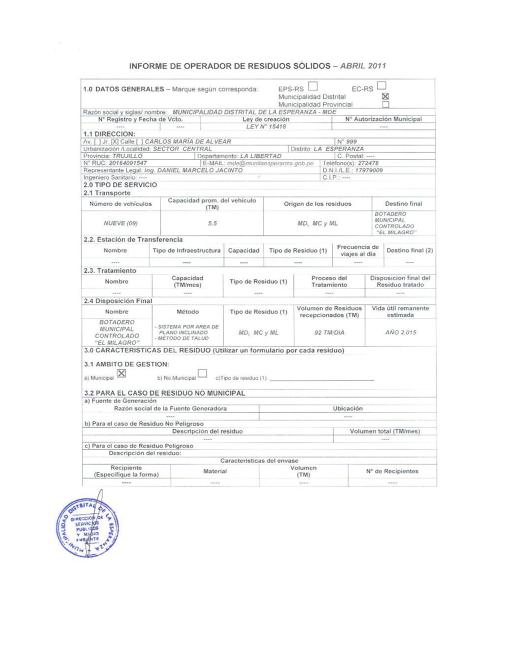 Informe de Operador de Residuos Sólidos del II Trimestre 2011 de la Municipalidad Distrital de La Esperanza
