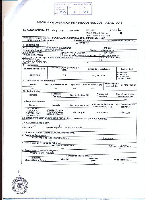 Informe de Operador de Residuos Sólidos del II Trimestre 2015 de la Municipalidad Distrital de La Esperanza