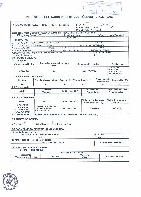 Mediante este Informe de Operador de Residuos Sólidos correspondiente al II Trimestre del 2015, la Municipalidad Distrital de La Esperanza, en cumplimiento de la Ley General de Residuos Sólidos, informa como se realiza el servicio, la recolección y disposición final de los residuos municipales así mismo se describe el volumen total por mes recolectados de residuos y cantidad de personal encargado del servicio de recolección y transporte.