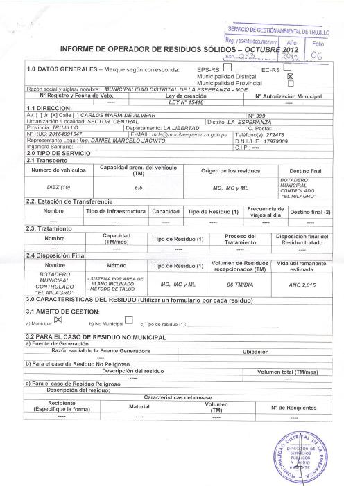 Informe de Operador de Residuos Sólidos del IV Trimestre 2012 de la Municipalidad Distrital de La Esperanza
