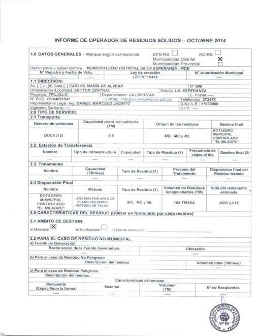 Informe de Operador de Residuos Sólidos del IV Trimestre 2014 de la Municipalidad Distrital de La Esperanza