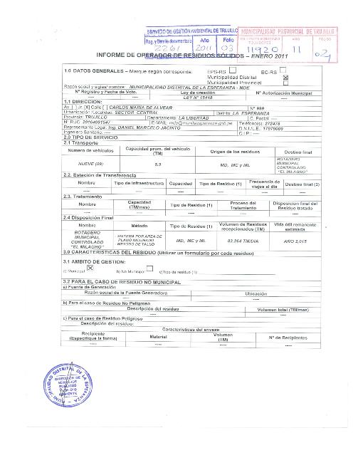 Informe de Operador de Residuos Sólidos-Primer Trimestre 2011 de la Municipalidad Distrital de La Esperanza