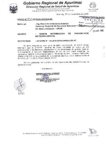 Estación Meteorológica Nº 01 la cual viene emitiendo los parámetros básicos e importantes para el Monitorea de Aire Material Particulado (PM10 y PM 2.5) en la atmosfera de la ciudad de Abancay por cuál se emite el INFORME Nº 116-2019-DESA/DIRESA.GR.AP.