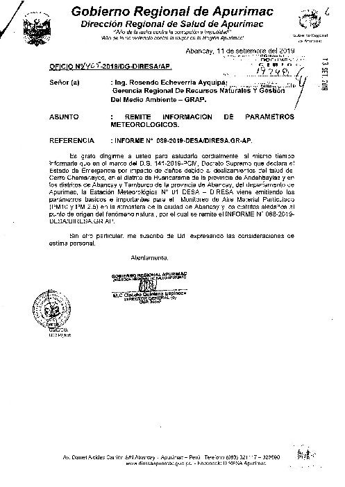 Informe que en el marco del D.S. 141-2019-PCM, Decreto Supremo que declare el Estado de Emergencia por impacto de daños debido al deslizamiento del talud del cerro Chamanayoc, en el distrito de huancarama de la provincia de Andahuaylas y en los distritos de Abancay, Tamburco
