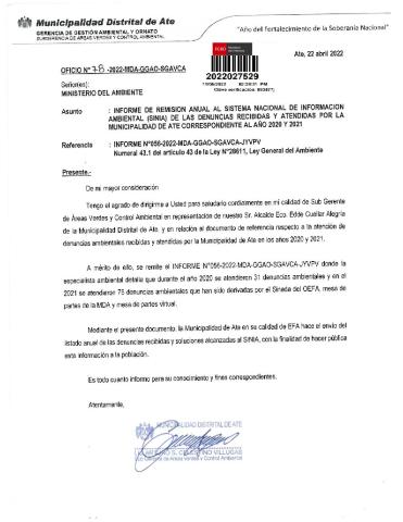 Informe de remisión anual al SINIA de las denuncias recibidas y atendidas por la Municipalidad de Ate correspondiente al año 2020 y 2021