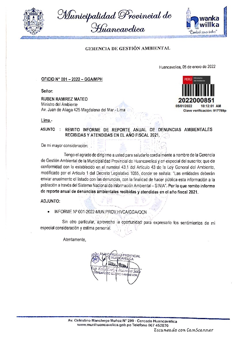 Informe de reporte anual de denuncias ambientales recibidas y atendidas en el año fiscal 2021 de la municipalidad provincial de Huancavelica