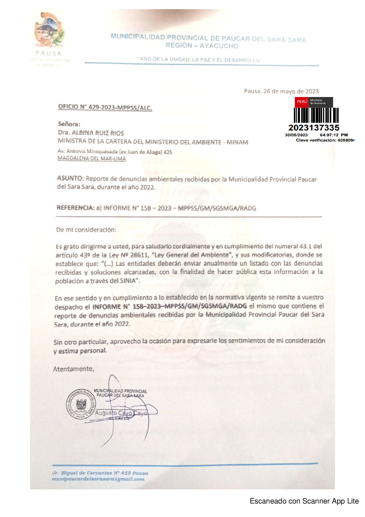 Informe sobre reporte de denuncias ambiental es anuales 2022 Municipalidad Provincial del Sara Sara