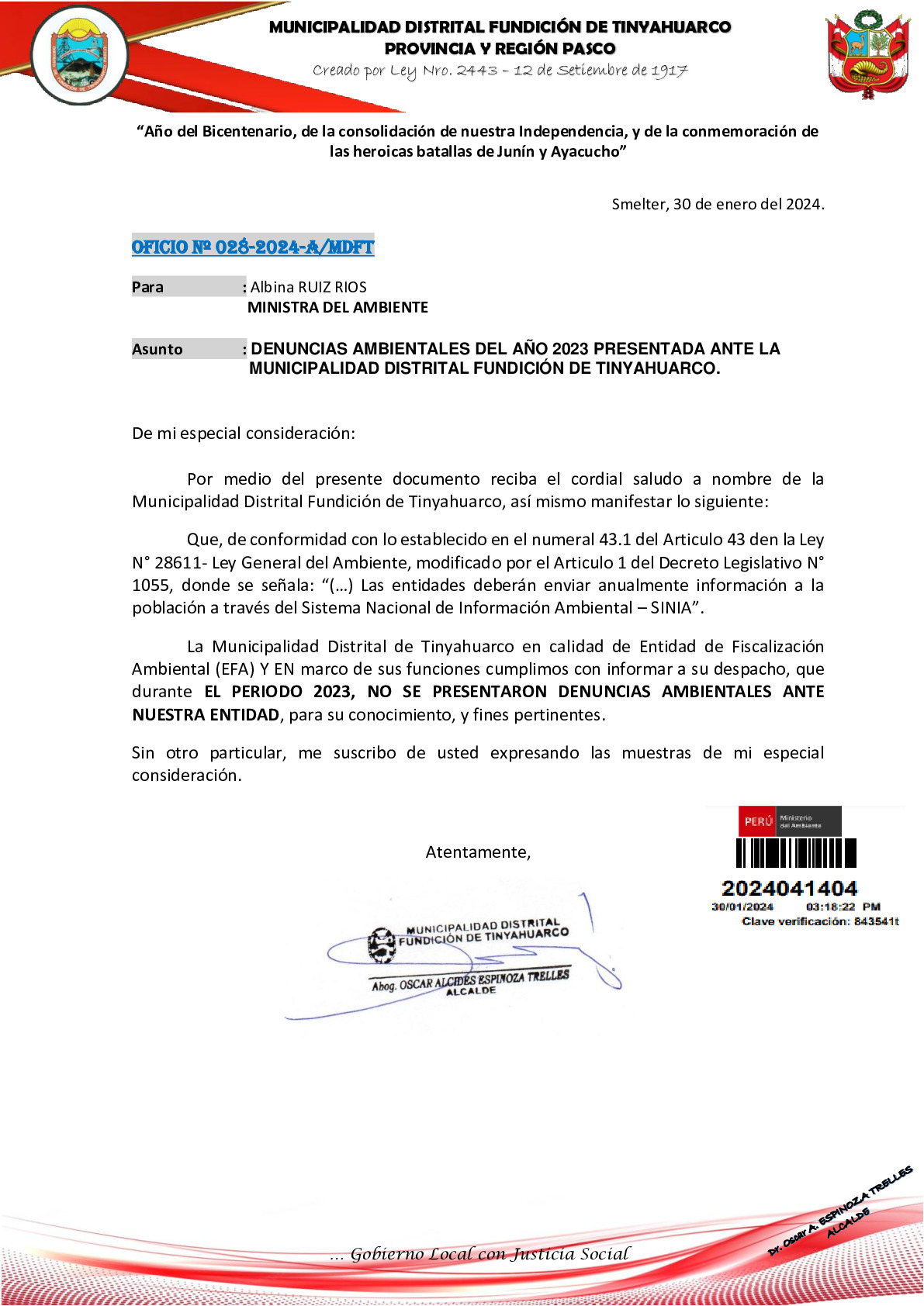 Informe sobre reporte de denuncias ambiental es anuales 2023 Municipalidad Distrital de Tinyahuarco