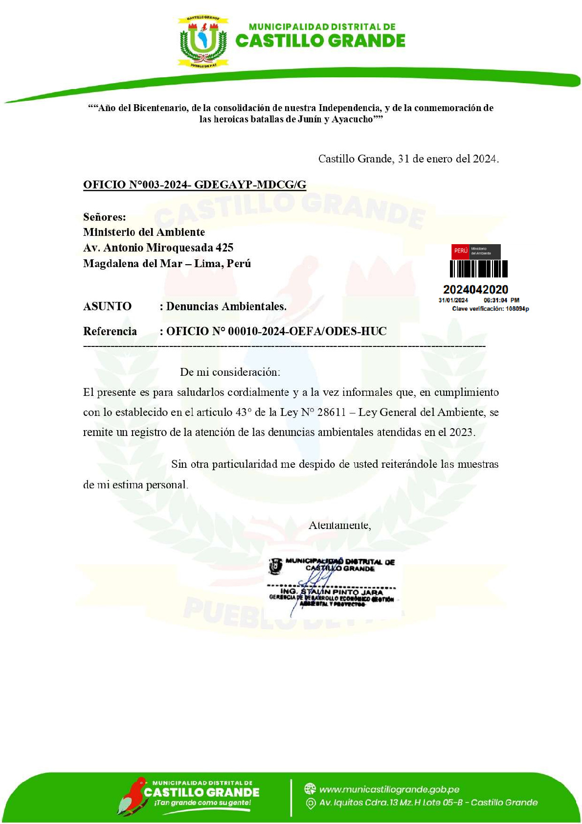 Informe sobre reporte de denuncias ambiental es anuales 2023 Municipalidad Distrital de Castillo Grande