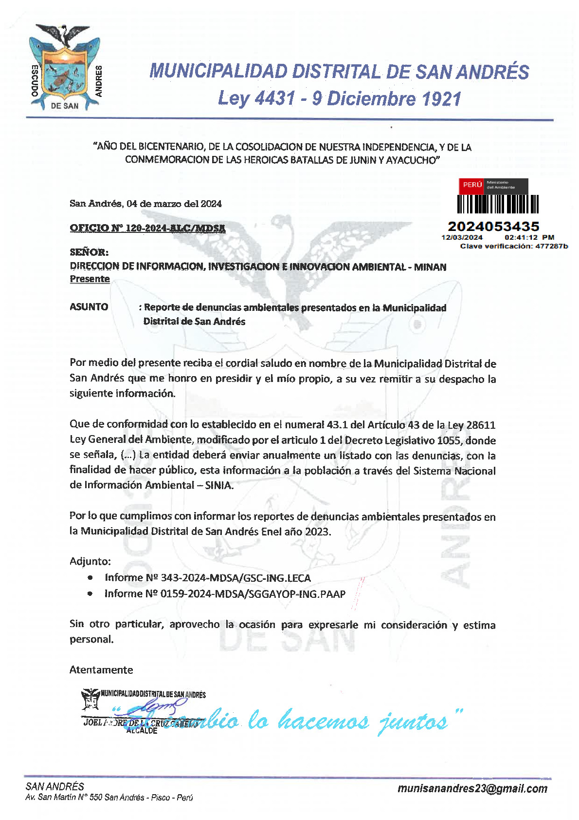 Informe sobre reporte de denuncias ambiental es anuales 2023 Municipalidad Distrital de San Andres
