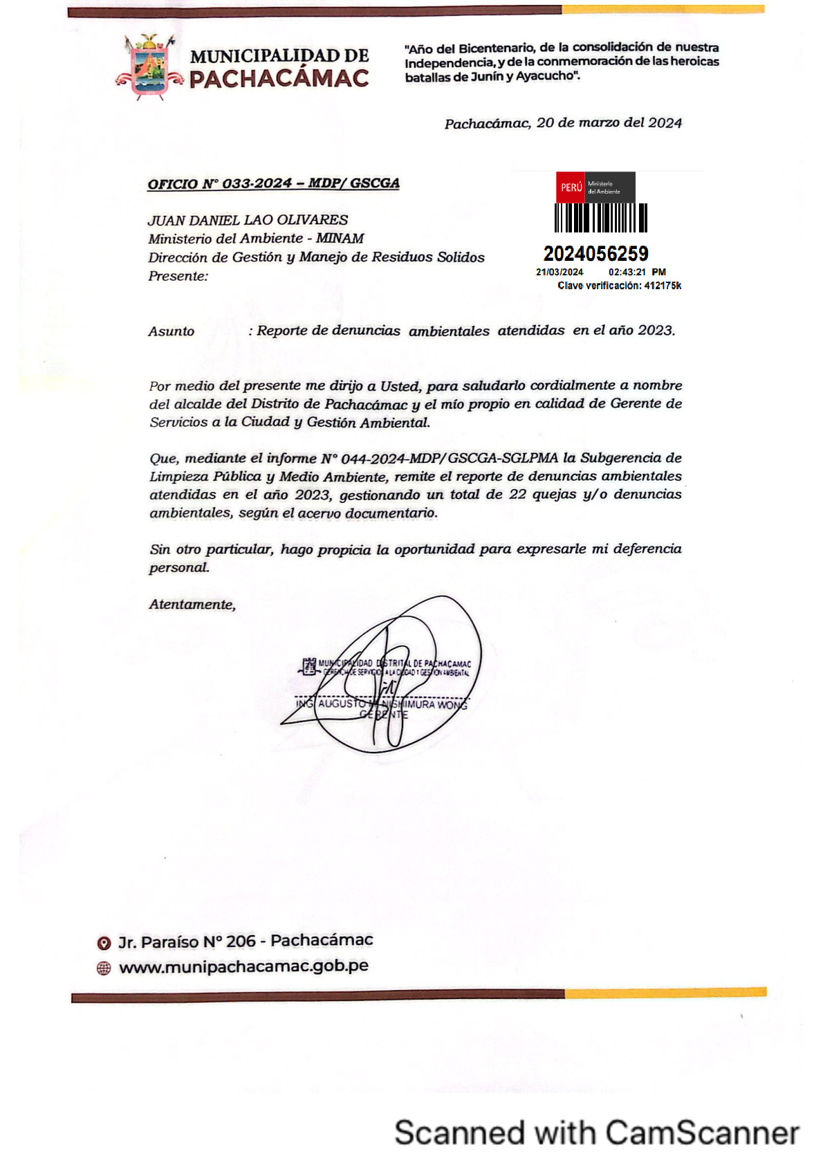 Informe sobre reporte de denuncias ambiental es anuales 2023 Municipalidad Distrital de Pachacamac