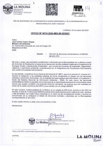 Informe sobre reporte de denuncias ambiental es anuales 2023 Municipalidad Distrital de La Molina