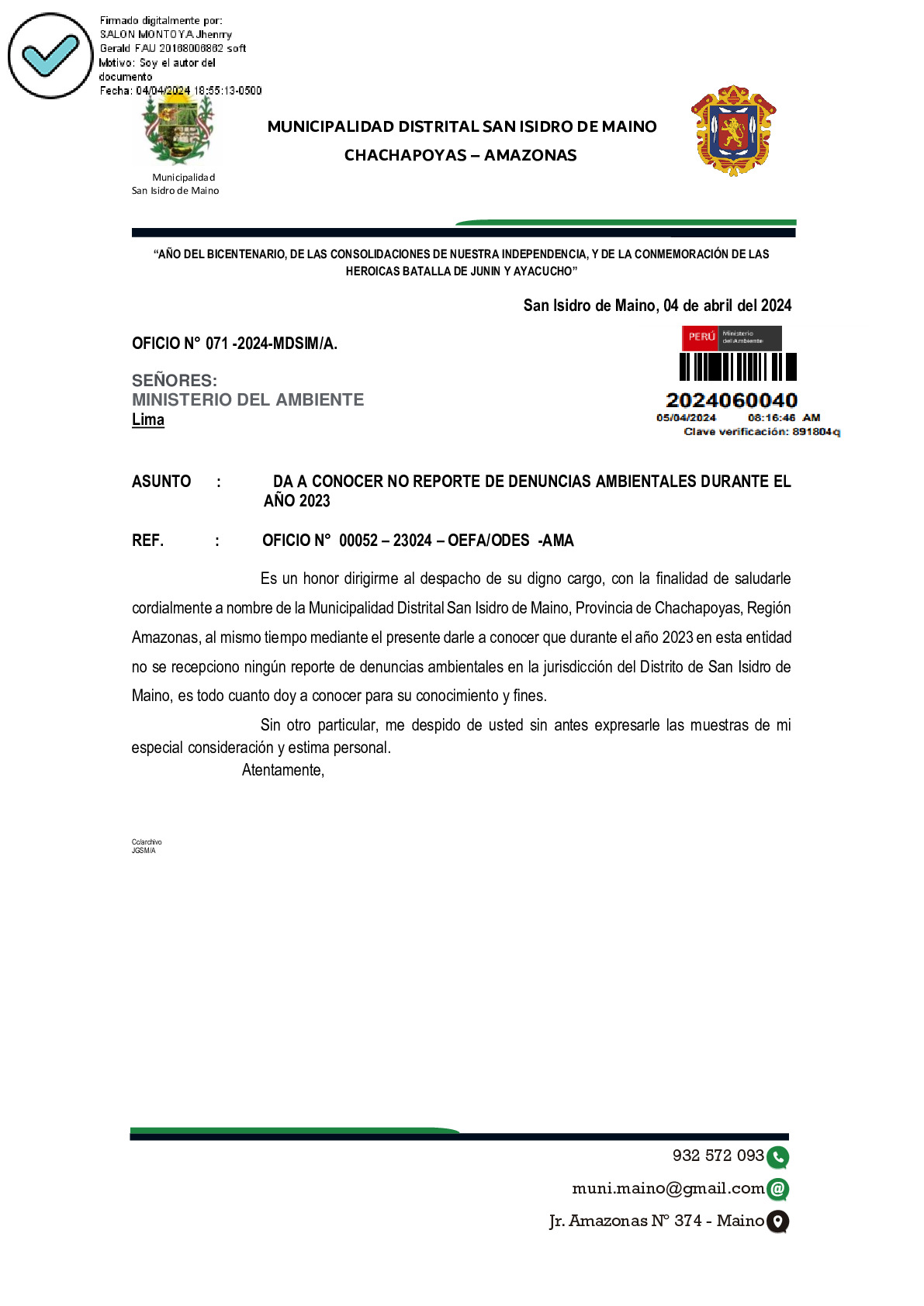 Informe sobre reporte de denuncias ambiental es anuales 2023 Municipalidad Distrital de San Isidro de Maino