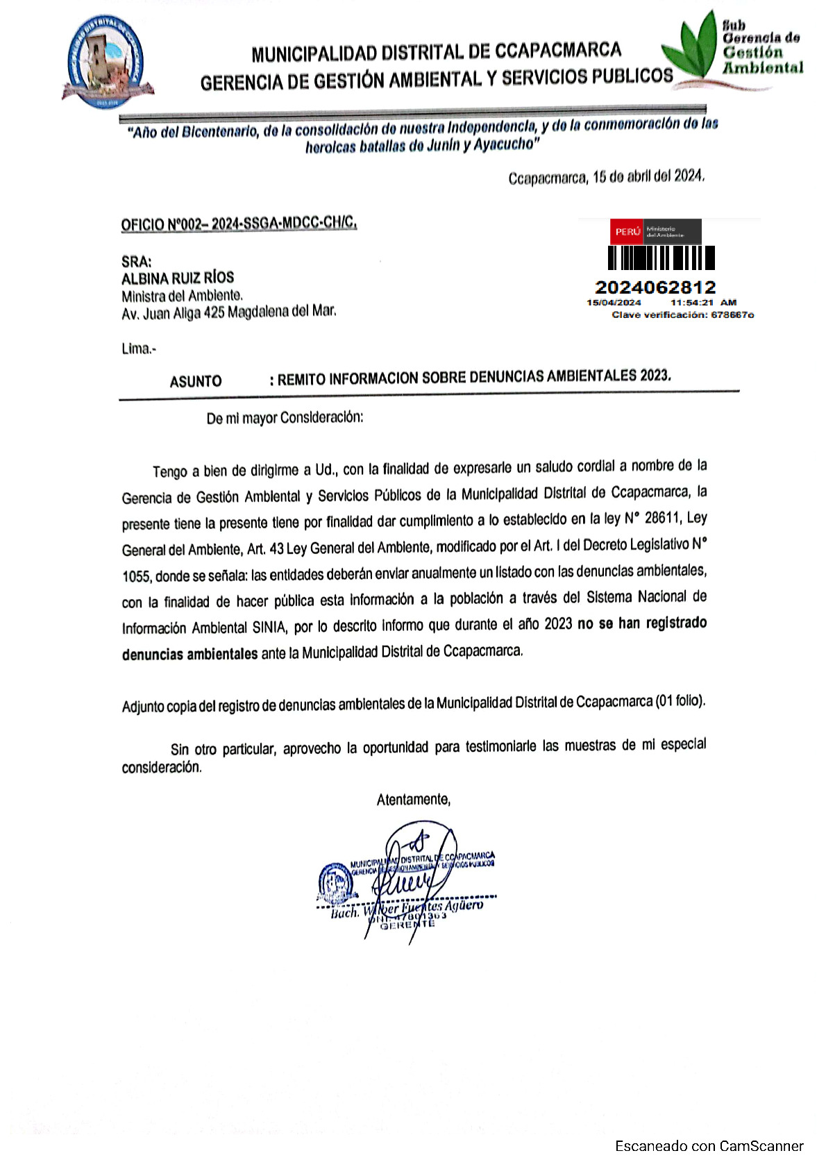 Informe sobre reporte de denuncias ambiental es anuales 2023 Municipalidad Distrital de Ccapacmarca