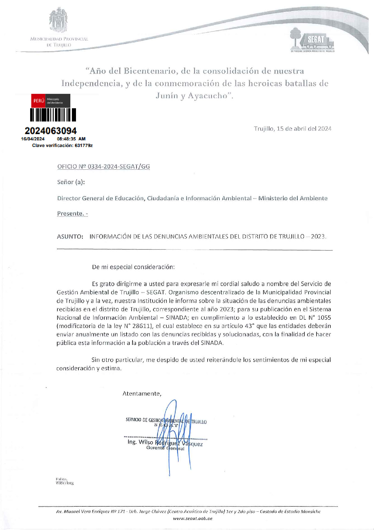 En cumplimiento de lo establecido en el Decreto Legislativo N° 1055 que modifica el artículo 43° de la Ley N° 28611, que indica que "Las entidades deberán enviar anualmente un listado con las denuncias recibidas y soluciones alcanzadas, con la finalidad de hacer pública esta información a la población a través del SINIA".