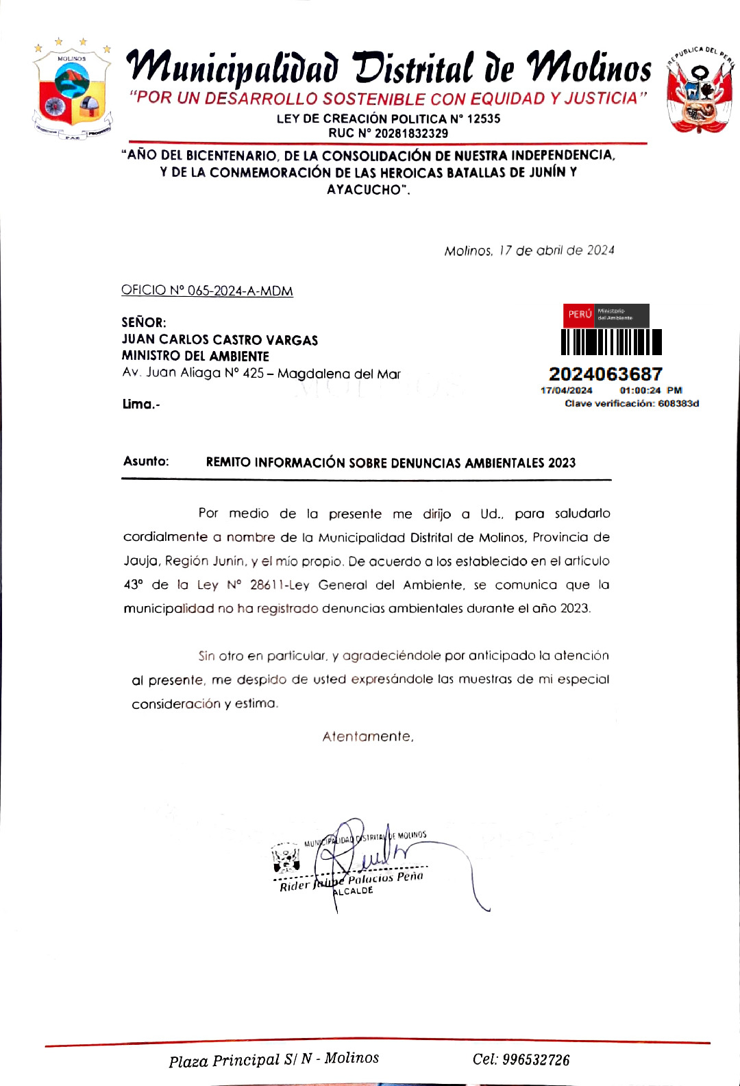 Informe sobre reporte de denuncias ambiental es anuales 2023 Municipalidad Distrital de Molinos