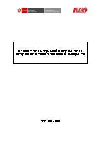 El presente Informe hace una sintesis de la situación actual de la gestión de los residuos al nivel nacional; consta de 04 capitulos que abordan de manera sintética la situación actual de los residuos sólidos de ámbito municipal desde un enfoque basado en el análisis de la oferta y la demandas de los servicios de salud pública vinculados a los poreceso u operaciones de recolección, almacenamiento, transporte, tratamiento y disposición final de los residuos sólidos domiciliarios, comerciales y de los espacios públicos.