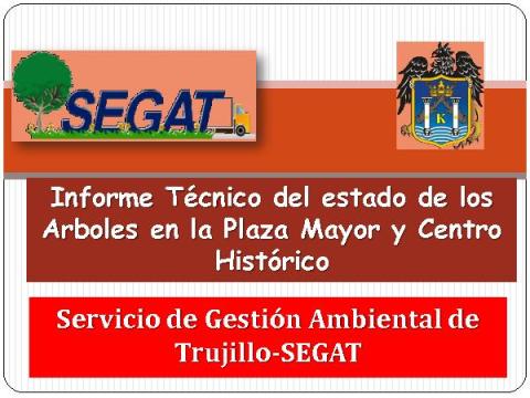 El Servicio de Gestión Ambiental de Trujillo (SEGAT), ofreció una exposición técnica el 09 de Julio ante diversas instituciones locales y regionales, sobre el estado fitosanitario de las áreas de la Plaza Mayor y la plazuela El Recreo. Esta actividad se desarrolló en el Salón Consistorial del Palacio Municipal.Según el informe hay un total de 8 árboles en mal estado que se ubican en el centro histórico de la ciudad y pondrían en riesgo la integridad física de las personas transeúntes. Solo en la Plaza de Armas se han registrado 3 poncianas y 2 palmeras donde gran parte de la corteza está dañada (podrida).