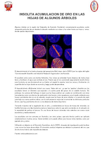 Algunos árboles en la región de Kalgoorlie de Australia Occidental, concretamente eucaliptos, están atrapando partículas de oro desde el subsuelo mediante sus raíces y las suben hasta sus hojas y ramas, donde quedan depositadas.