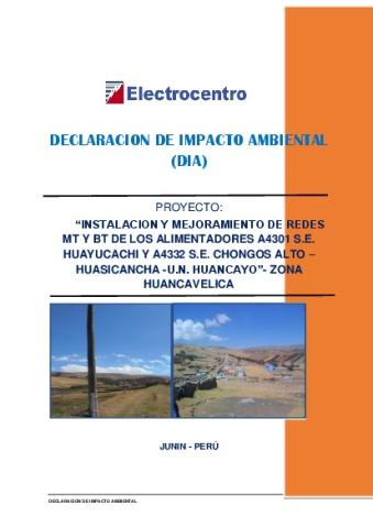 La DIA del proyecto: “INSTALACION Y MEJORAMIENTO DE REDES MT Y BT DE LOS ALIMENTADORES A4301 S.E. HUAYUCACHI Y A4332 S.E. CHONGOS ALTO – HUASICANCHA -U.N. HUANCAYO” – ZONA HUANCAVELICA , tiene como objetivo identificar, evaluar y cuantificar los impactos sobre el medio ambiente, y diseñar e implementar medidas Preventivas y/o correctivas; Elaborando el Plan de Manejo ambiental y establecer el plan de monitoreo para el control de los parámetros ambientales.