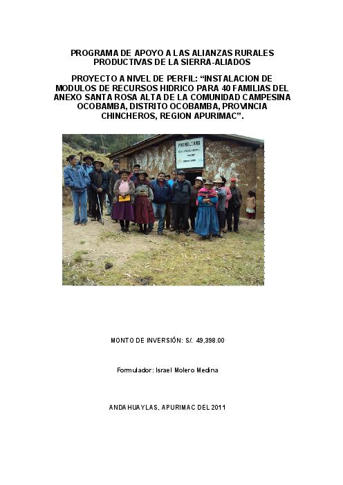 Instalacion de modulos de Recursos Hidricos para 40 familias del anexo Santa Rosa Alta de la comunidad campesina de Ocobamba, Distrito de Ocobamba, Provincia de Chincheros, Region Apurimac