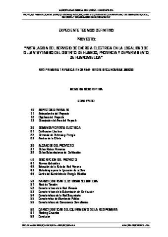 El presente estudio tiene como objeto contar con el Expediente Técnico Definitivo de la Red Primaria para la ejecución del proyecto “Instalación del Servicio de Energía Eléctrica en la Localidad de Ollantaytambo del Distrito de Huando, Provincia y Departamento de Huancavelica”, conformado por la Memoria Descriptiva, Especificaciones Técnicas, Metrado y Presupuesto, Cálculos Justificativos, Cronograma de Ejecución de Obra y Planos y Detalles de Armados.