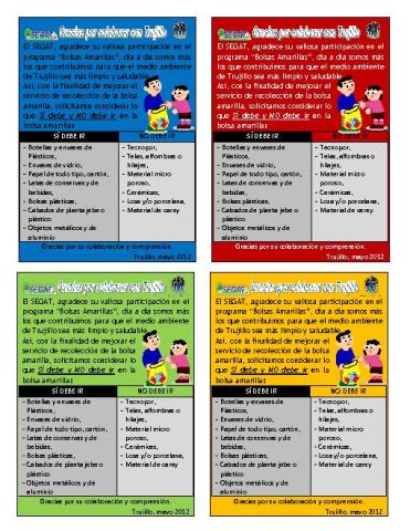 En este instructivo elaborado por el Servicio de Gestión Ambiental de Trujillo, enseña como separar los residuos sólidos para los personas que partipan en el programa de segregación implementado por el SEGAT.