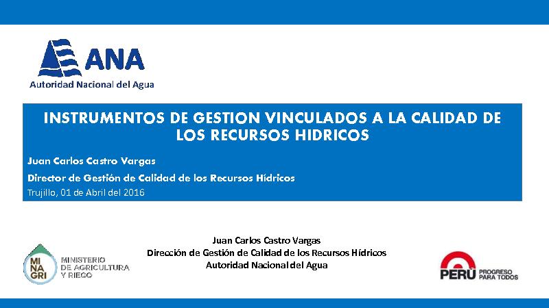 Esta presentación fue realizada por el Ms.c Juan Carlos Castro, Director de Gestión de Calidad de los Recursos Hídricos de la Autoridad Nacional del Agua en el Foro “Agua y Minería”, que tuvo como objetivo de proyectar un ambiente de análisis, discusión y conceso, en temas de cómo es que la minería aprovecha los recursos hídricos y el proceso. Este foro fue organizado por el Ministerio de Agricultura y Riego (MINAGRI), la Autoridad Nacional del Agua (ANA), y la Gerencia Regional de Energía, Minas e Hidrocarburo los días 31 de Marzo y 01 de Abril del 2016 en el Auditorio del Colegio de Ingenieros de La Libertad.
