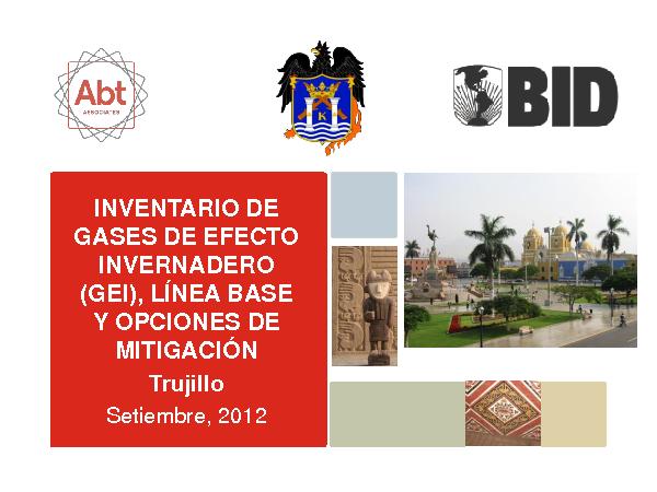 En esta presentación se informa del Inventario de gases de efecto invernadero (GEI), línea base y opciones de mitigación en Trujillo. Los GEI considerados son: dióxido de Carbono, metano y oxido nitroso. Las opciones de mitigación que se desarrollara en Trujillo es involucrando energía, transporte y residuos sólidos.
