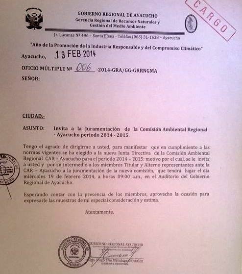 El día Miércoles 19 de Febrero se llevará acabo la Juramentación de la nueva junta directiva de la comisión ambiental regional CAR, en el auditorio del Gobierno Regional Ayacucho.