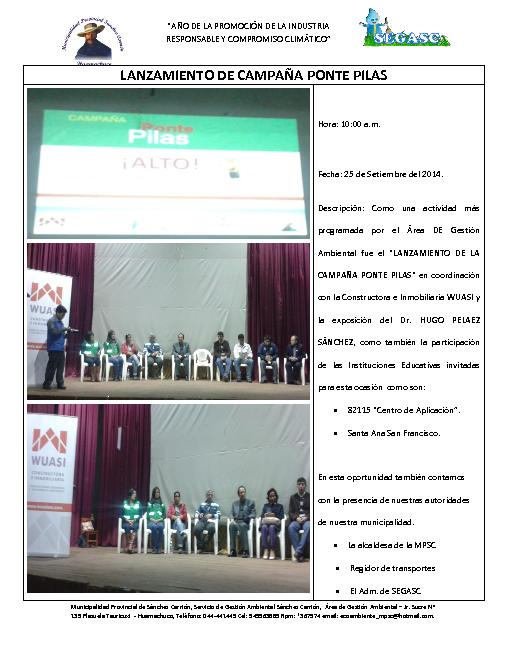 Como una más de las actividades programadas por el Area de Servicio de Gestión Ambiental - SEGASC - Huamachuco, fue el lanzamiento de la campaña "Ponte Pilas", contando con la intervención del Dr. Hugo Pelaez Sánchez entre otras autoridades.