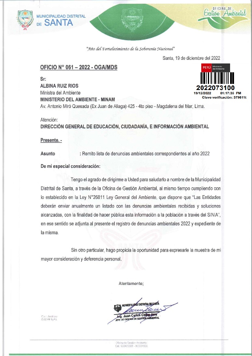 Lista de denuncias ambientales correspondientes al año 2022 de la Municipalidad Distrital de Santa