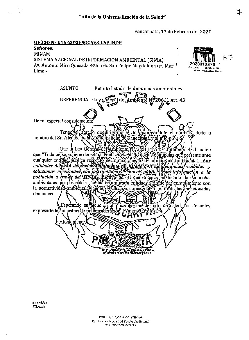 Listado de denuncias ambientales 2019 Municipalidad Distrital de Paucarpata