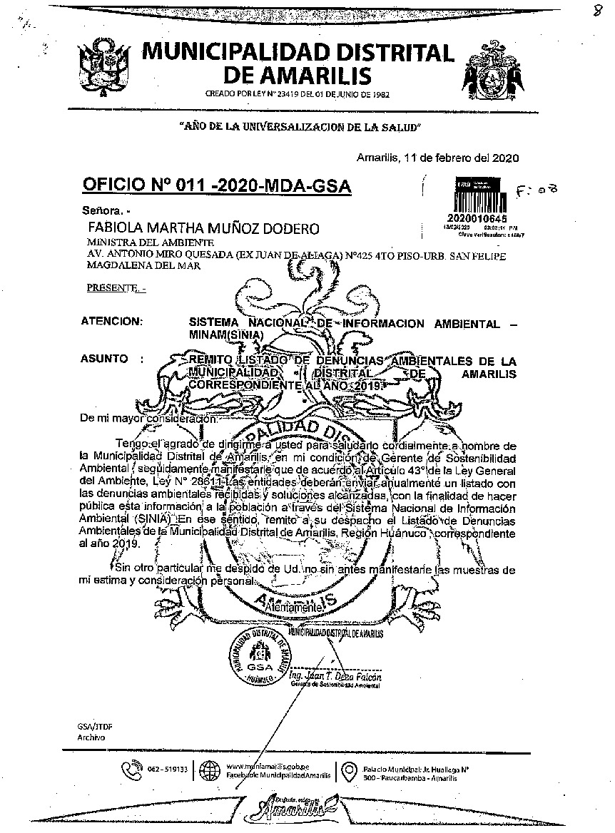 Listado de denuncias ambientales 2019 Municipalidad Distrital de Amarilis